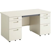 丈夫で長持ち、定番スチールデスク。組み立て無料で手間いらず。袖引き出しは全段をまとめてロックできる鍵付き仕様。