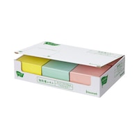 買い置きにおすすめの通常粘着ポストイットの大容量タイプ。フタをミシン目でちぎるとオープンボックスになって取り出しやすい。伝言や情報整理に便利な定番サイズ。エコマーク認定。古紙パルプ配合率100%。